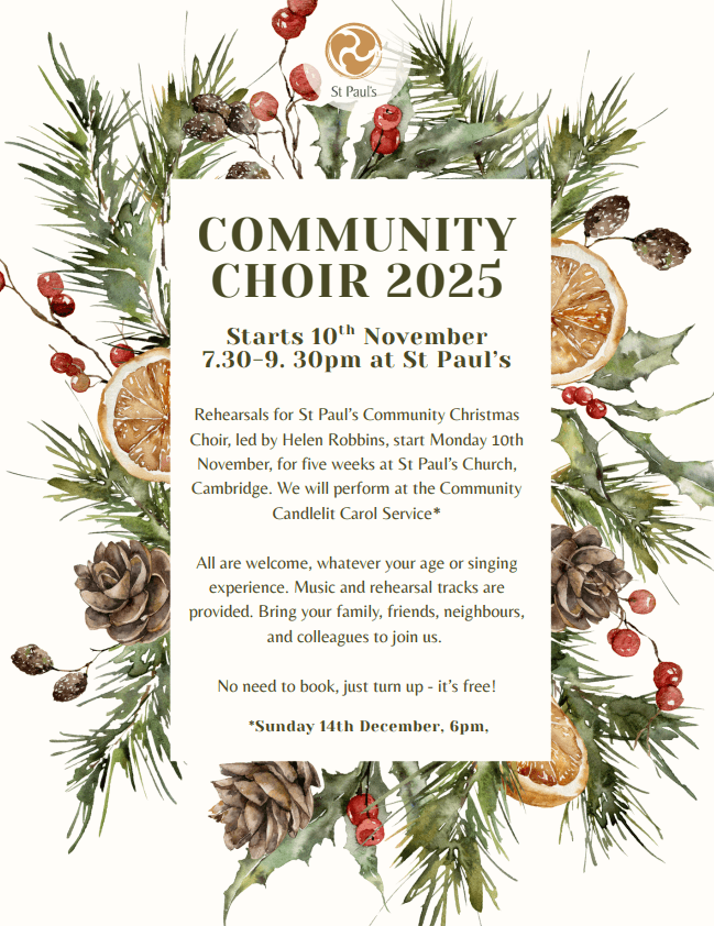 We look forward to welcoming you to St Paul's - a worshipping community and busy community centre at the heart of Cambridge. We gather together on Sundays to worship at 10.30am and 6pm. Through the week we have various meals and prayer groups where you can meet people and learn more about the faith we share. There is an opportunity to make a difference through volunteering at one of our community projects.